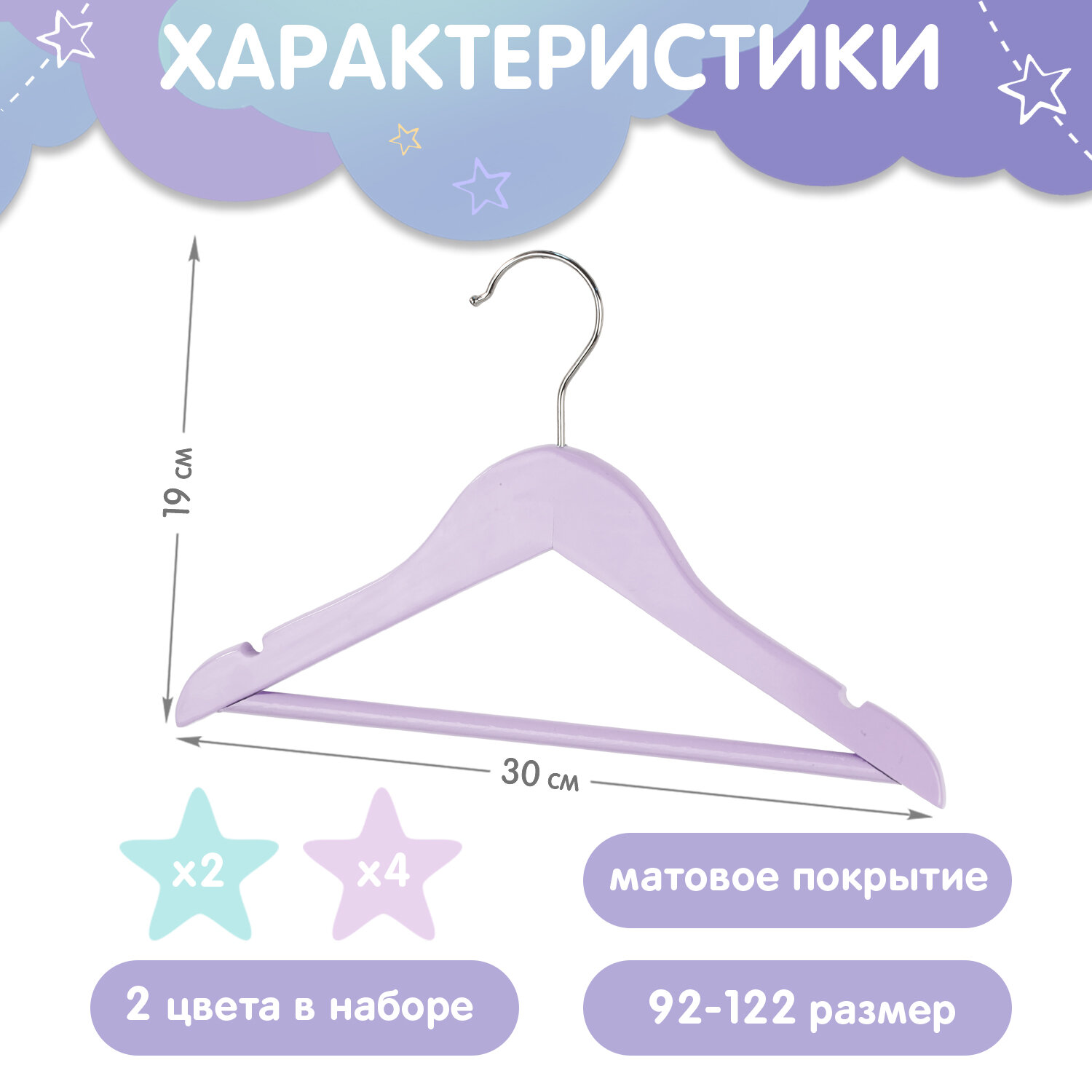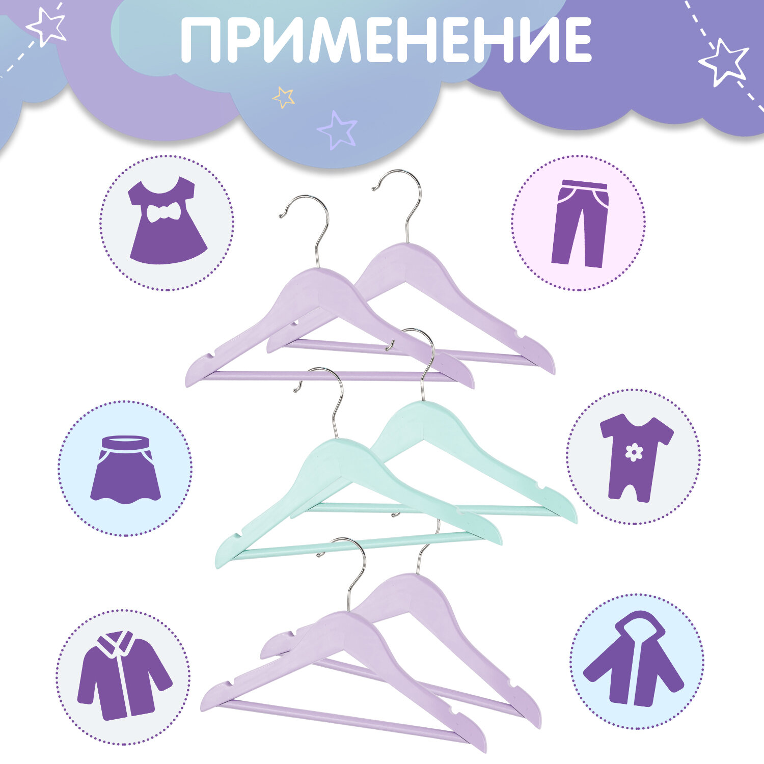 10 цен на Набор вешалок детских цветных деревянных, 6 шт., с перекладиной, с выемками, 30*19*1.2 см, сиреневый/бирюзовый