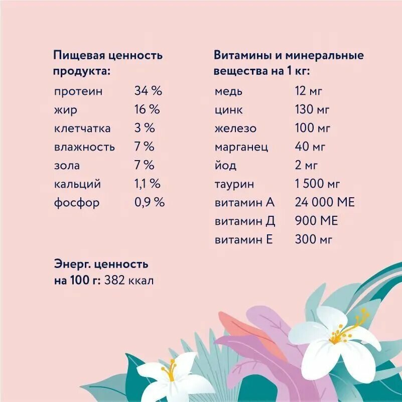 | Минеральные вещества | кальций 1,1%, фосфор 0,9%, медь 12 мг/кг, цинк 130 мг/кг, железо 100 мг/кг, марганец 40 мг/кг, йод 2 мг/кг, таурин 1500 мг/кг |