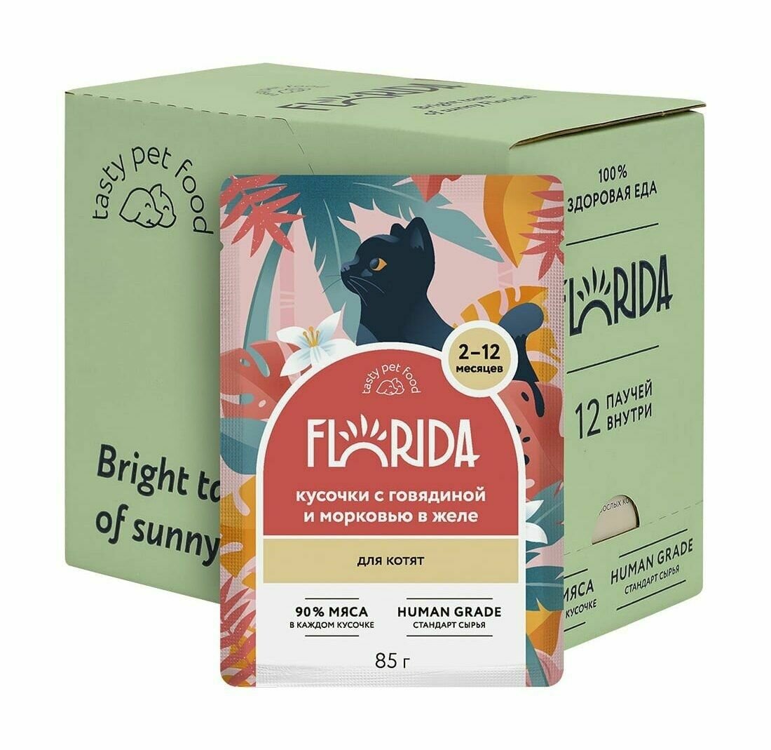 Florida паучи для котят (кусочки в желе) Говядина и морковь, 85 г. упаковка 12 шт информация:
