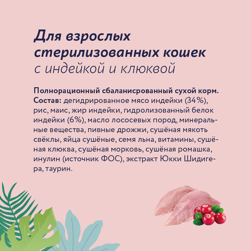 FLORIDA Сухой корм для взрослых стерилизованных кошек с индейкой и клюквой 3+1кг, 4кг информация: