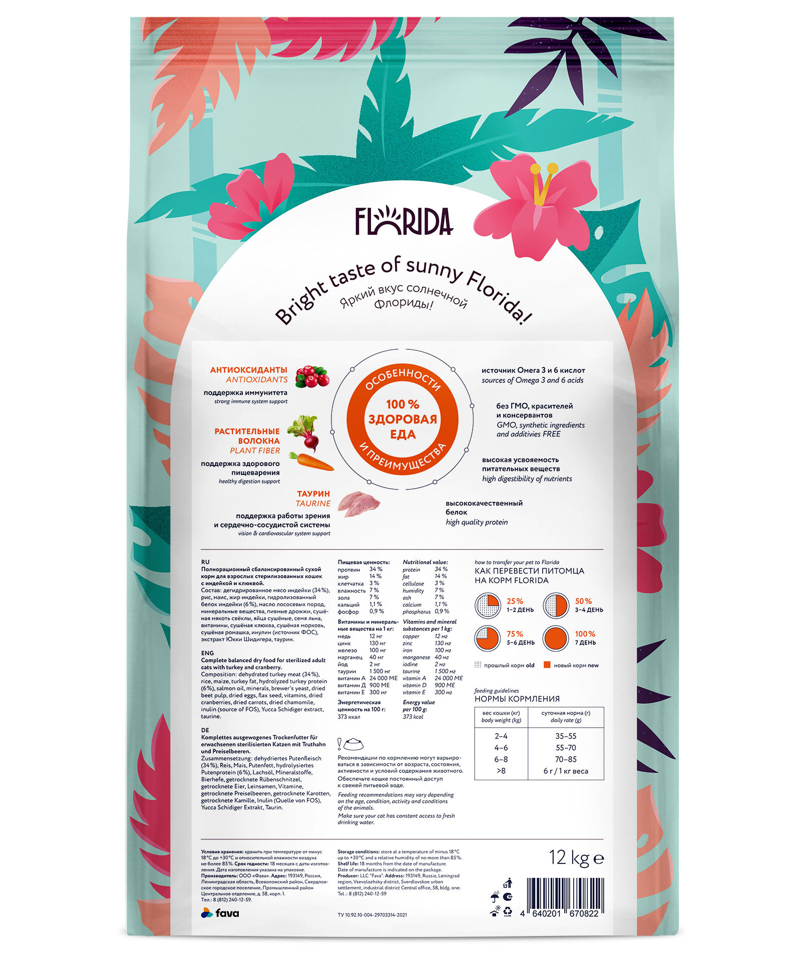 Сухой корм FLORIDA для взрослых стерилизованных кошек: индейка с клюквой 12кг информация: