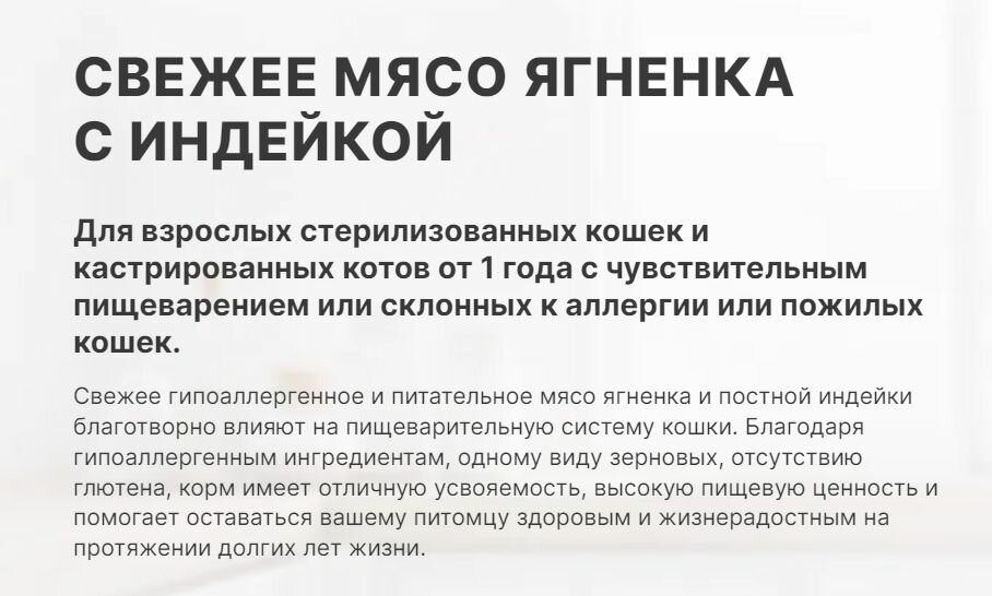 | Возраст животного | взрослые (1-6 лет) / котята (до 1 года) / пожилые (7+) |