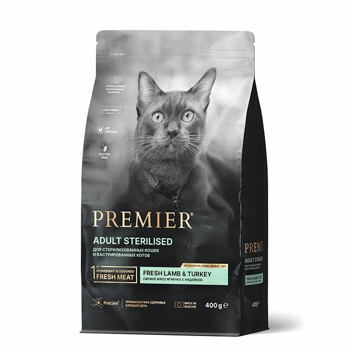 Premier Cat Turkey Sterilised сухой корм для взрослых стерилизованных кошек, свежее мясо индейки, 400 г 800 ₽