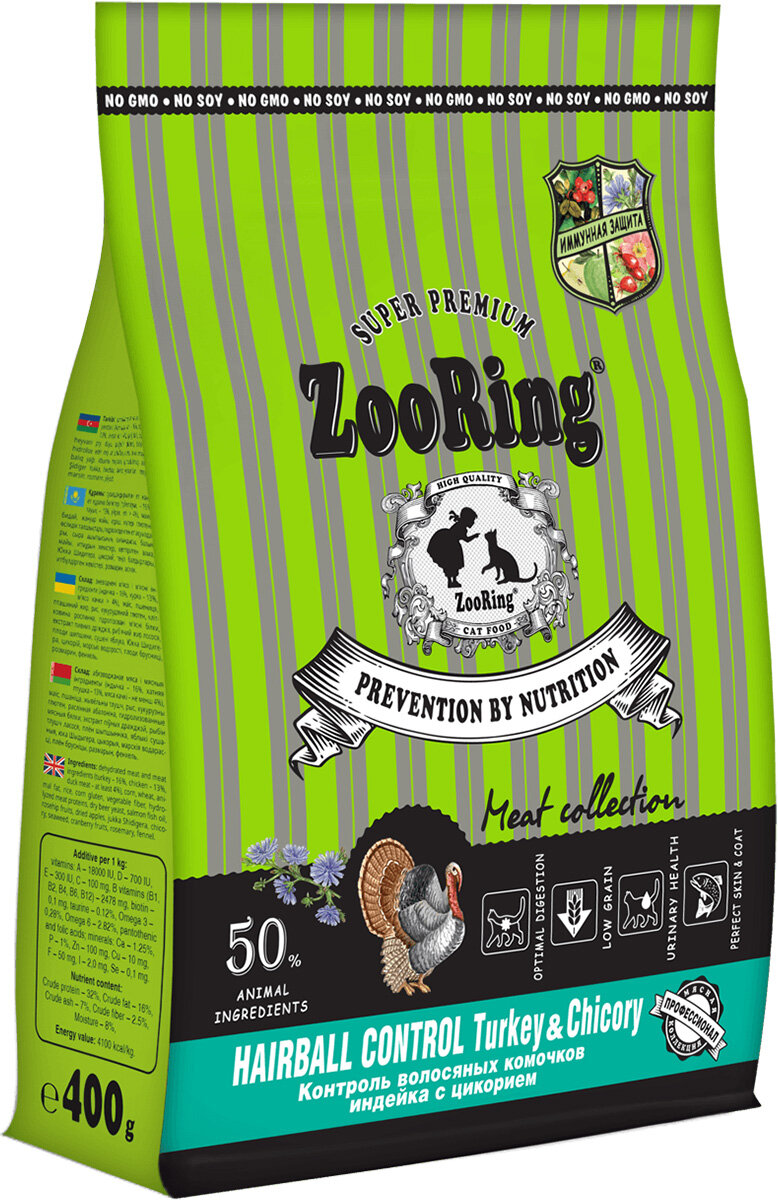 Сухой корм ZooRing Adult Cat Hairball Control Индейка с цикорием, 400г 382 ₽