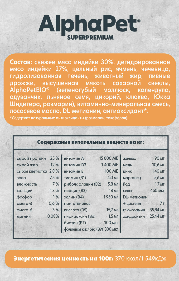 AlphaPet Superpremium Monoprotein сухой корм для взрослых собак средних и крупных пород с индейкой - 12 кг информация: