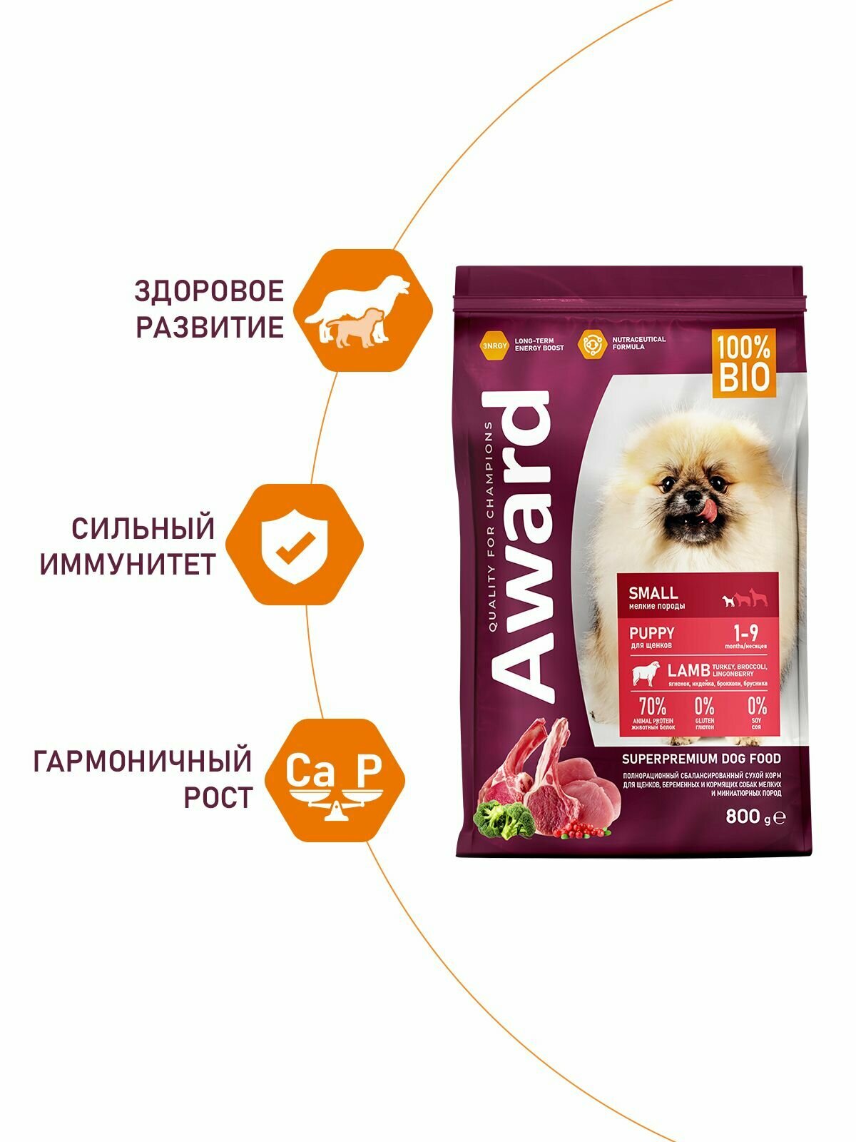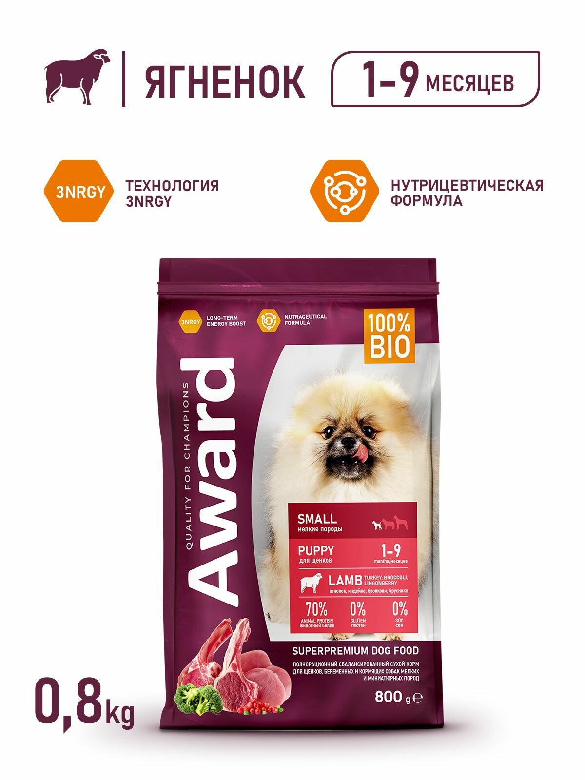 Сухой корм AWARD для щенков, беременных и кормящих собак мелких пород с ягненком, индейкой, брокколи и брусникой 800г информация: