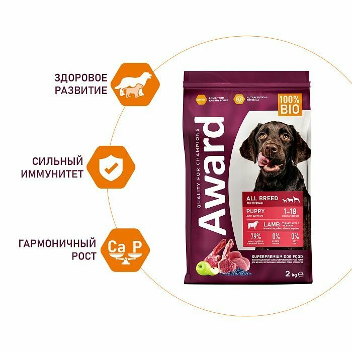 Сухой корм 2 кг с индейкой и ягненком AWARD для щенков от 1 месяца, беременных и кормящих сук всех пород, 1 упаковка информация: