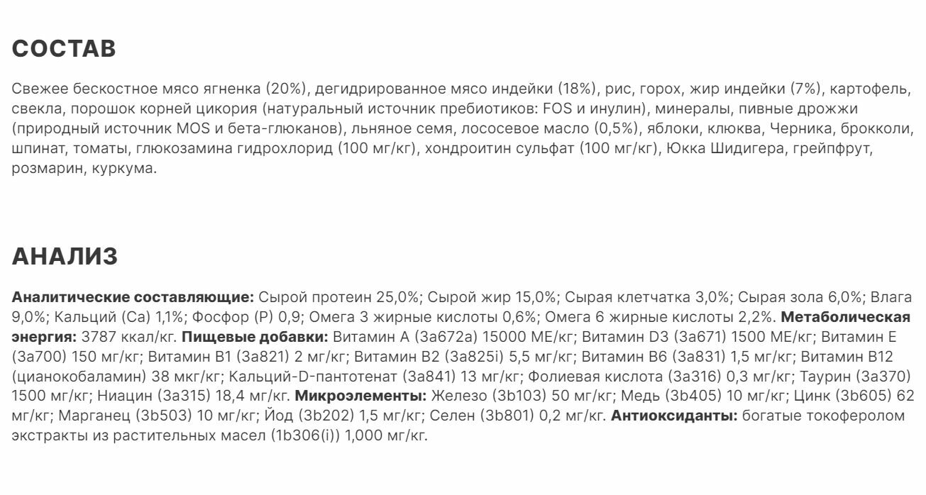 | Возраст животного | взрослые (1-6 лет) / пожилые (7+) / щенки (до 1 года) |