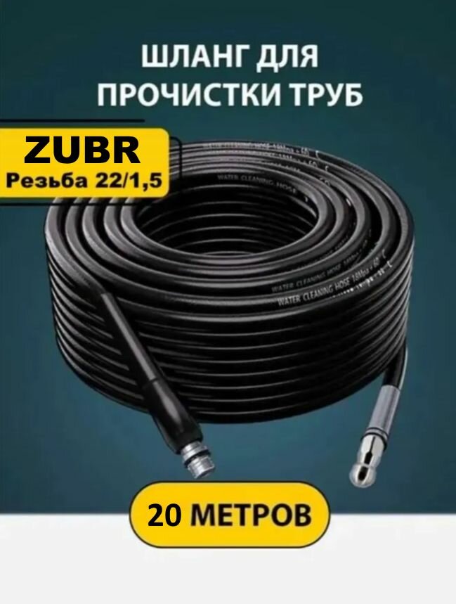 Шланг для прочистки труб и канализации с форсункой 1 бой вперед 3 назад и адаптером с резьбой 22-1,5 для мойки Зубр (Zubr) 20м. информация: