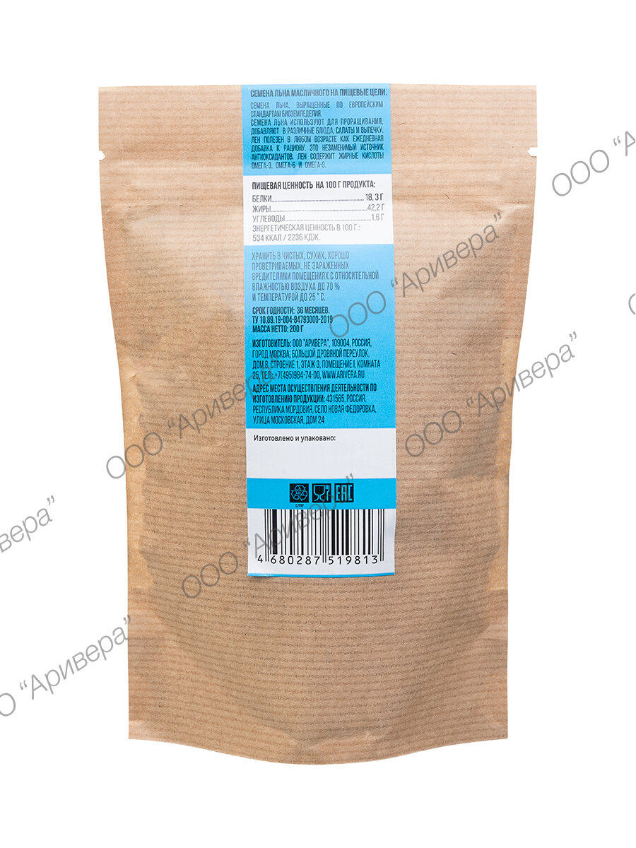 Семена льна масличного аривера БИО 200 г, пакет информация: