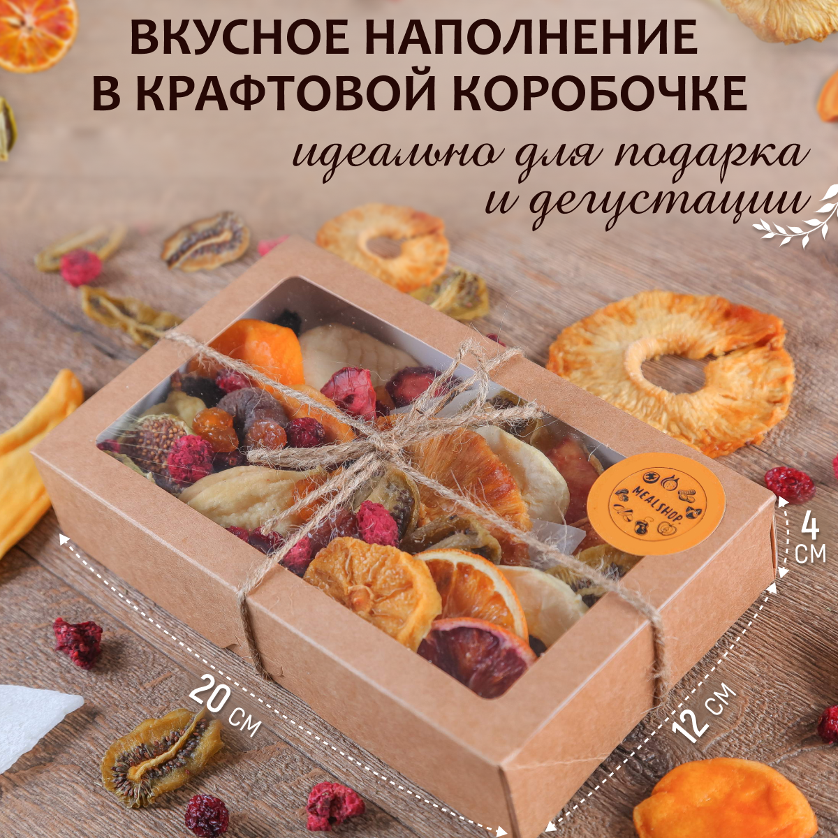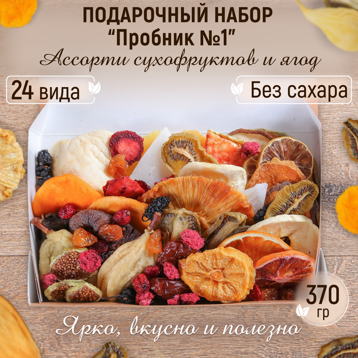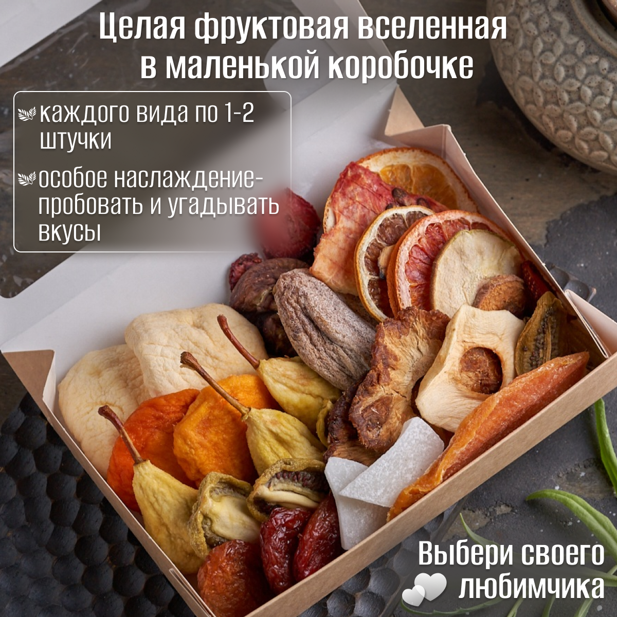 | Вид сухофруктов | ананас / апельсин / арбуз / груша / инжир / киви / клубника / клюква / лимон / малина / манго / персик / слива / тутовник / хурма / черешня / яблоко |