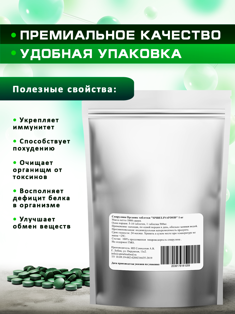 Спирулина Таблетки 2000шт Натуральная, 1кг информация: