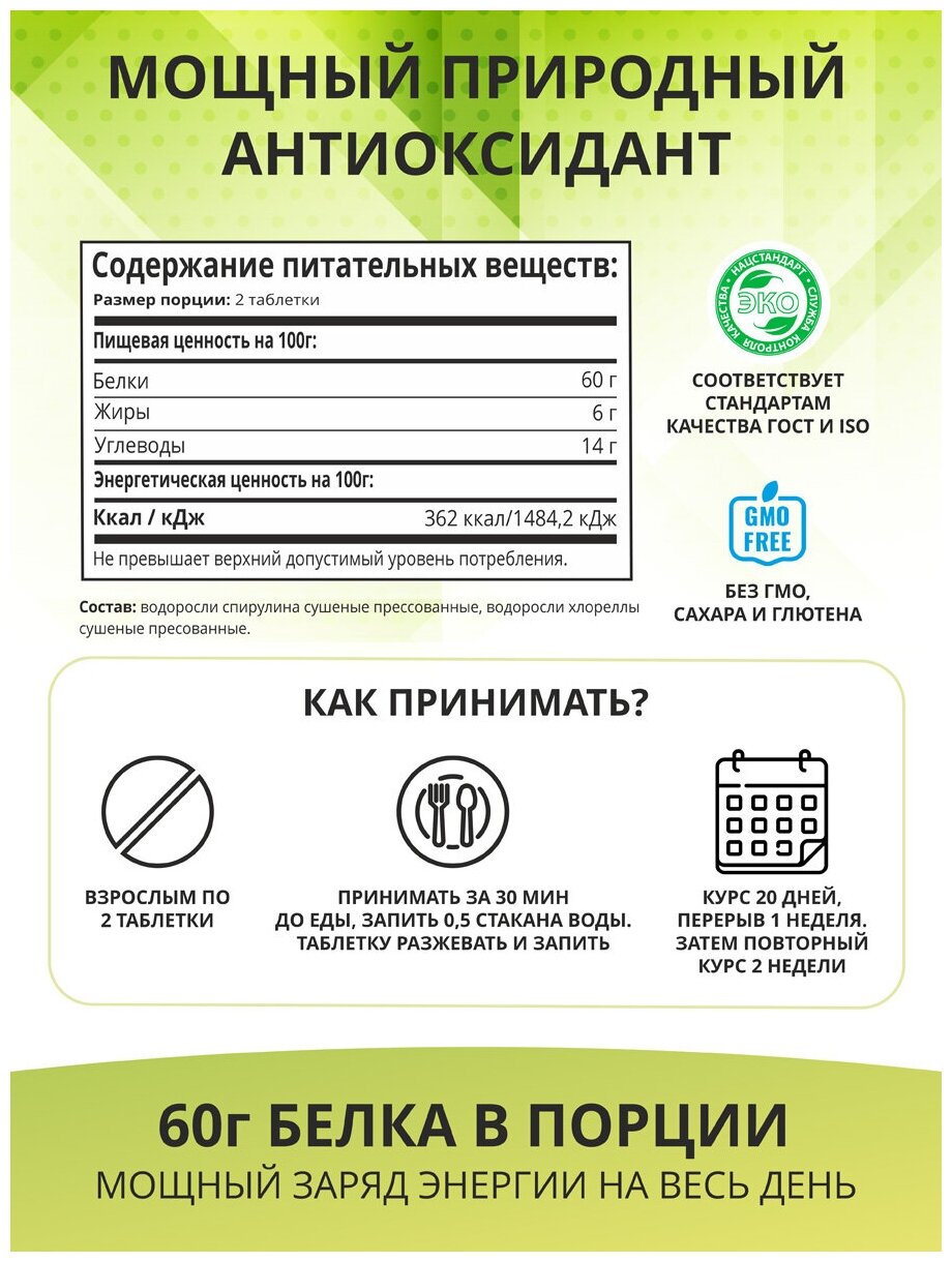 1WIN Хлорелла и Спирулина в таблетках микс, Chlorella + Spirulina, 100 грамм, морские водоросли диетические суперфуд информация: