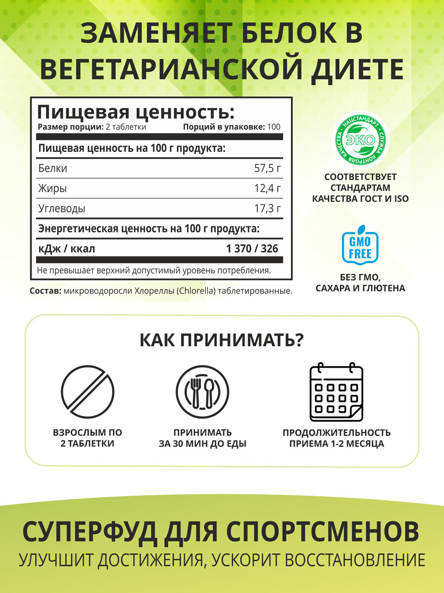 Хлорелла 100% натуральные водоросли, суперфуд в таблетках, для похудения, 100 г 654 ₽