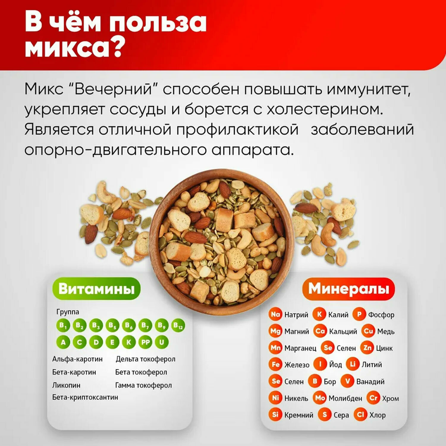 | Состав | миндаль, арахис жареный, кешью жаренный, тыквы семена запеченные, сухари пшеничные |