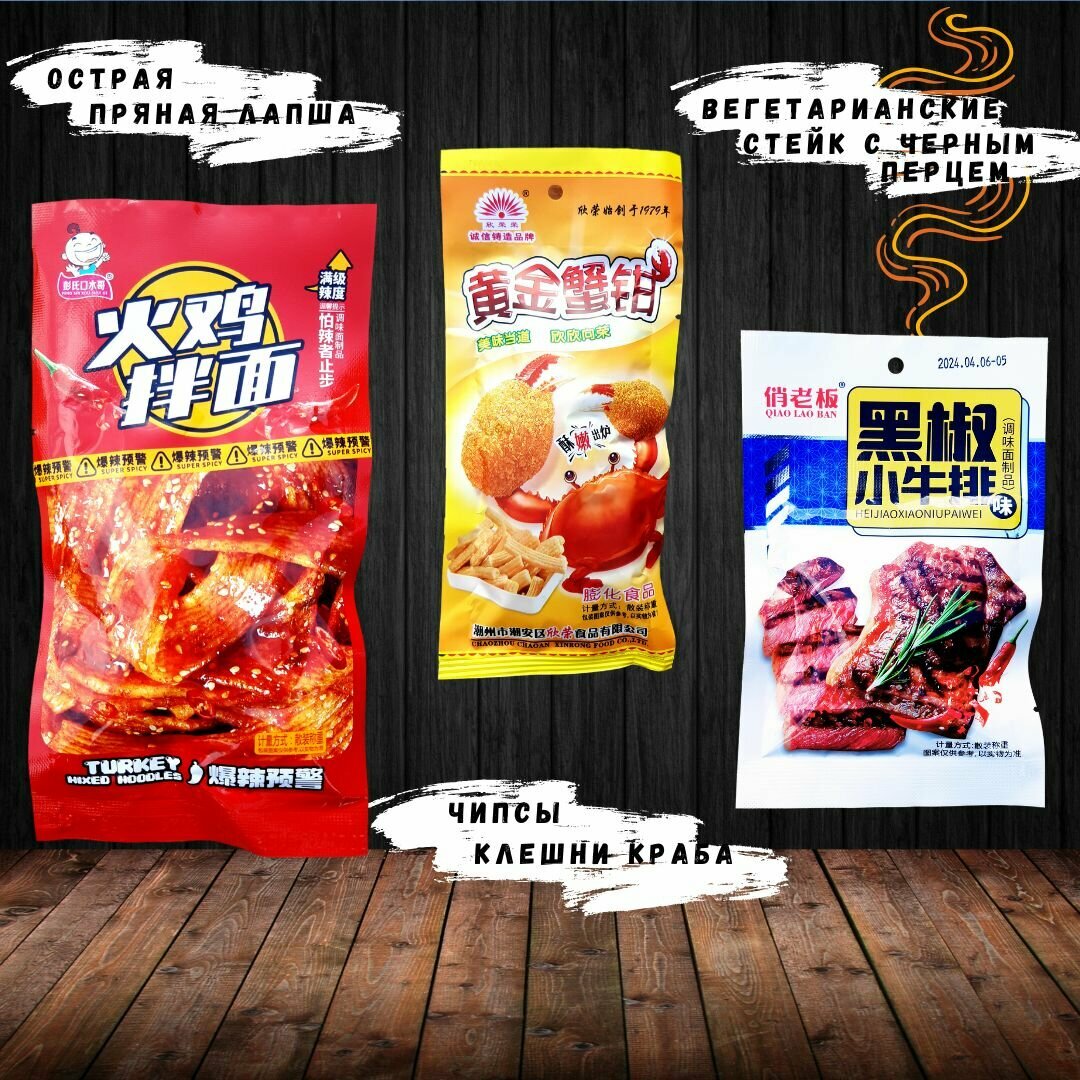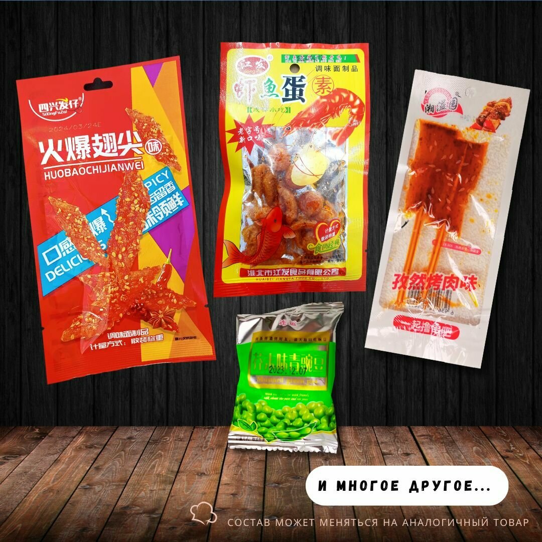 | Состав | Набор азиатских закусок включает 15 различных видов, среди которых: - Азиатские чипсы со сладко-острым вкусом. - Жареный горох и бобы со вкусом горчицы и говядины. - Вегетарианские соевые закуски со вкусом креветки, рыбы, лобстера, говядины и курицы. Состав закусок может меняться. |