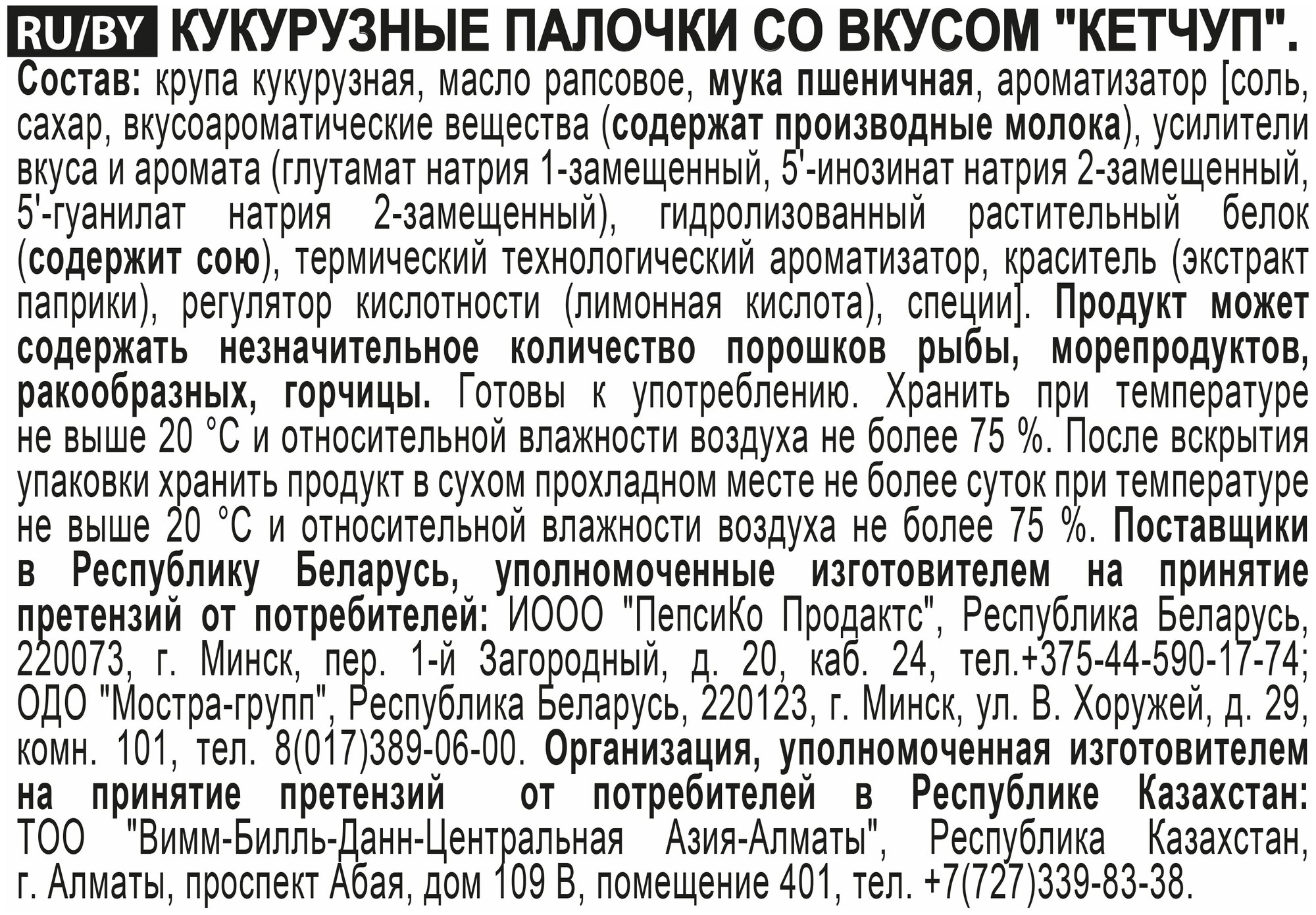 | Состав | крупа кукурузная, масло растительное, ароматизатор [пшеничная мука, соль, сахароза, вкусоароматические вещества (содержат производные молока), усилители вкуса и аромата (глутамат натрия 1-замещенный, 5'-инозинат натрия 2-замещенный, 5'-гуанилат натрия 2-замещенный), гидролизованный растительный белок (содержит сою), термический технологический ароматизатор, краситель (экстракт паприки), регулятор кислотности (лимонная кислота), специи] |