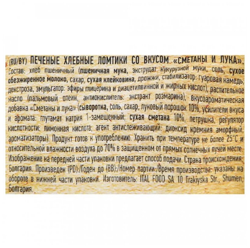 | Состав | хлеб пшеничный (пшеничная мука, экструдат кукурузной муки, соль, сухое обезжиренное молоко, сахар, сухая клейковина, дрожжи, стабилизатор: гуаровая камедь; декстроза, эмульгатор: эфиры глицерина и диацетилвинной и жирных кислот), растительное масло (пальмовый олеин, антиокислитель: экстракт розмарина), вкусоароматическая добавка «Средиземноморские овощи» (сахар, соль, мальтодекстрин, луковый порошок , порошок паприки , томатный порошок , чесночный порошок , сушёная петрушка, лактоза, усилители вкуса и аромата: глутамат натрия 1-замещенный, 5'-гуанилат натрия 2-замещенный, 5'-инозинат натрия 2-замещенный; мальтодекстрин, агент антислеживающий: диоксид кремния аморфный; регулятор кислотности: лимонная кислота; ароматизаторы). Продукт может содержать незначительное количество сои |