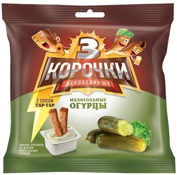 10 цен на Сухарики ржаные "3 корочки" малосол.огурцы с соусом тар-тар 60г