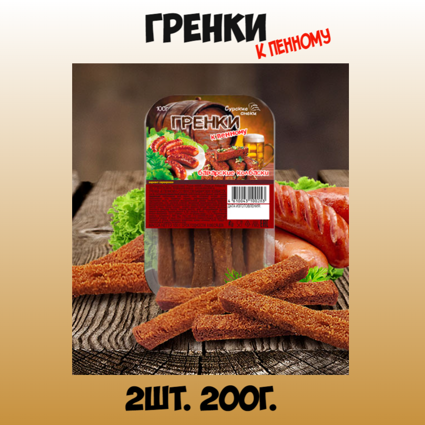 10 цен на Гренки к пенному Баварские колбаски 2шт по 100г."Сурские снеки"