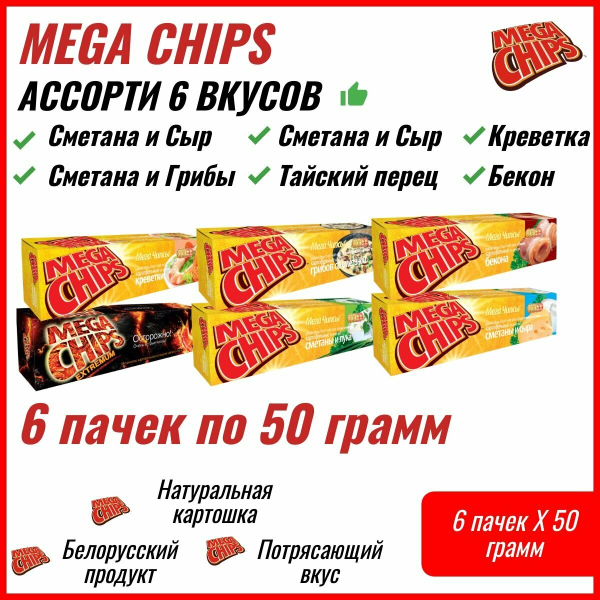 10 цен на Мегачипсы Mega Chips Ассорти всех вкусов, картофельные, 6 штук по 50 г