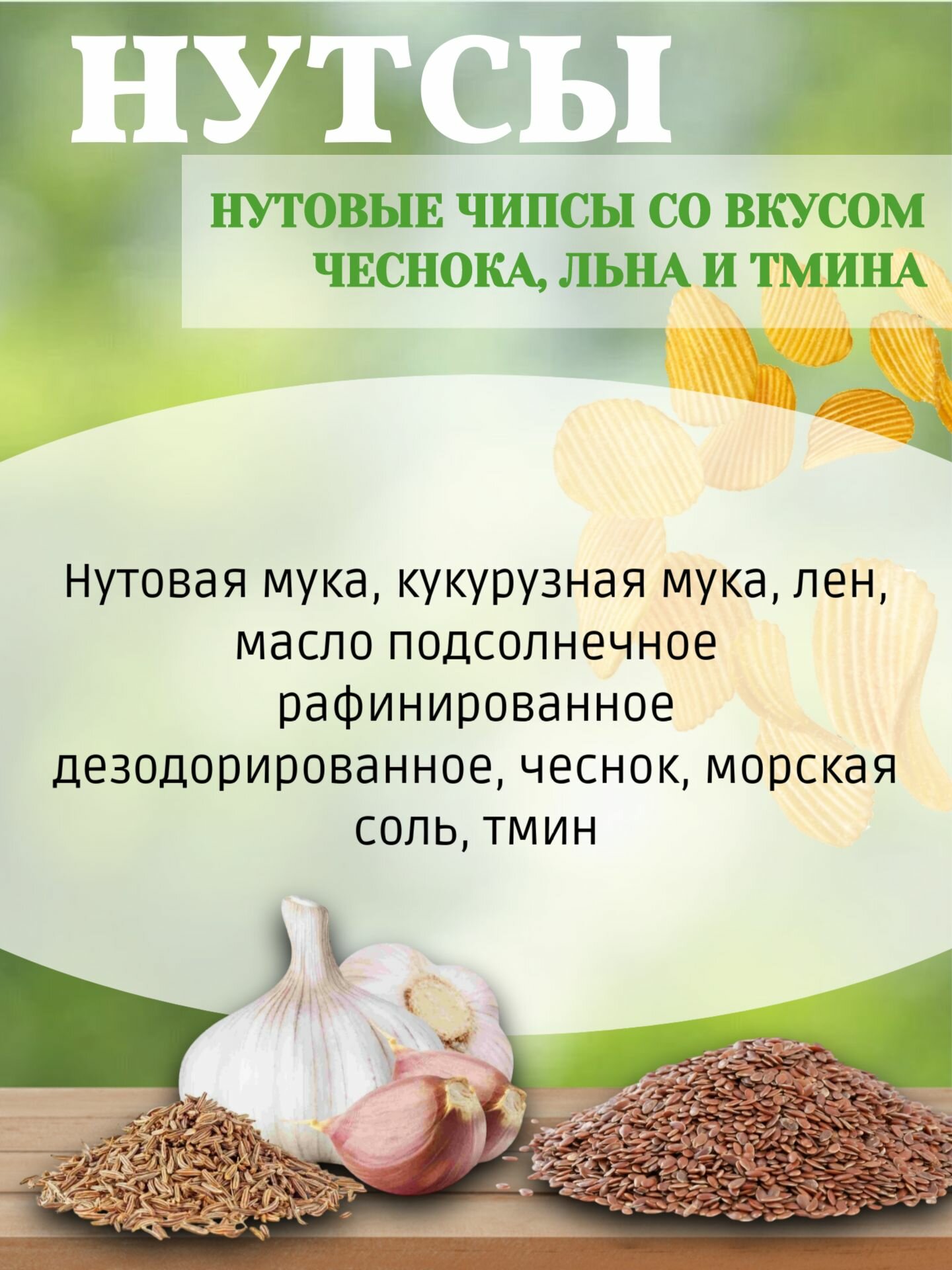 Чипсы нутовые б/глютена "Нутсы" чеснок, лен, тмин, 50 гр (2 шт. в наборе) информация: