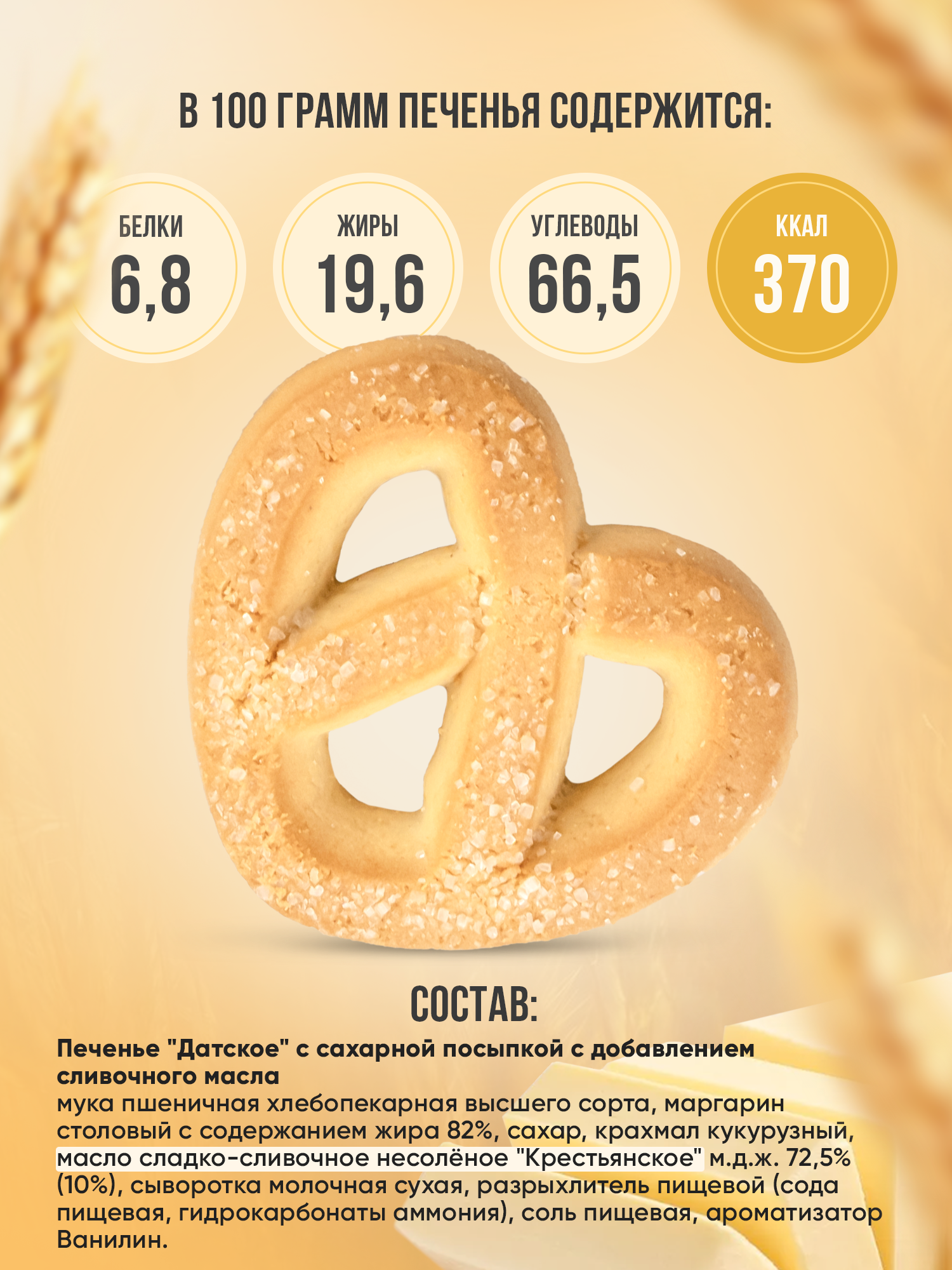 | Состав | мука пшеничная хлебопекарная высшего сорта, маргарин столовый с содержанием жира 82% (масла растительные, рафинированные дезодарированные (пальмовое, подсолнечные, кокосовое масла), вода, эмульгатор лецитин соевый, консервант сорбат калия)), сахар, крахмал кукурузный, масло сладко-сливочное несолёное ""Крестьянское"" м.д.ж. 72,5%, сыворотка молочная сухая, разрыхлитель пищевой (сода пищевая, гидрокарбонаты аммония), соль пищевая, ароматизатор Ванилин." |