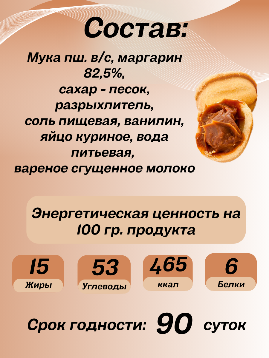 | Состав | масло сливочное 72,5% , мука пшеничная в/с , сахар-песок, разрыхлитель, инертный сироп, соль пищевая, вода питьевая, ванилин, яйцо куриное, вареная сгущёнка |