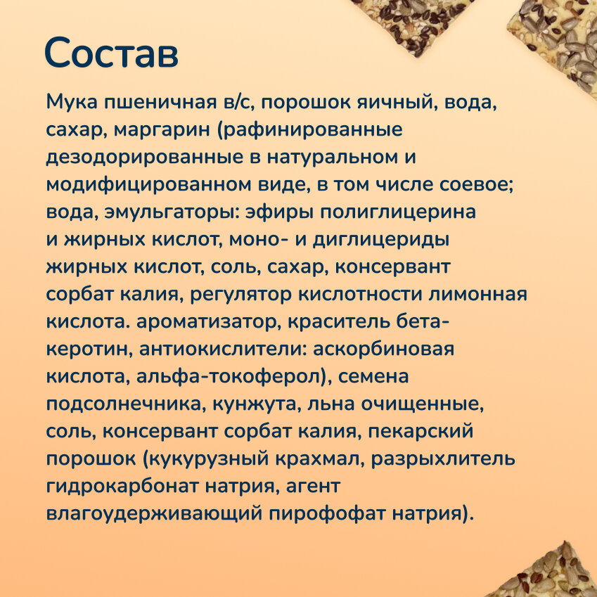 | Состав | мука пшеничная в/с, порошок яичный, вода, сахар, маргарин (рафинированные дезодорированные масла в натуральном и модифицированном виде, в том числе соевое; вода, эмульгаторы: эфиры полиглицерина и жирных кислот, моно-и диглицериды жирных кислот; соль, сахар, консервант сорбат калия, регулятор кислотности лимонная кислота, ароматизатор, краситель бета-каротин, антиокислители: аскорбиновая кислота, альфа-токоферол), семена подсолнечника, кунжута, льна очищенные, соль, консервант сорбат калия, пекарский порошок (кукурузный крахмал, разрыхлитель гидрокарбнат натрия, агент влагоудерживающий пирофосфат натрия) |