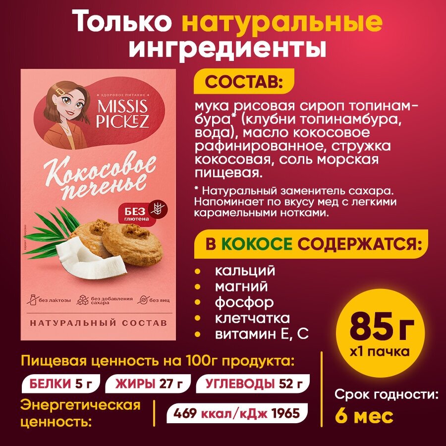 Печенье кокосовое без сахара без глютена "Missis Pickez" 3 пачки по 100 г 725 ₽