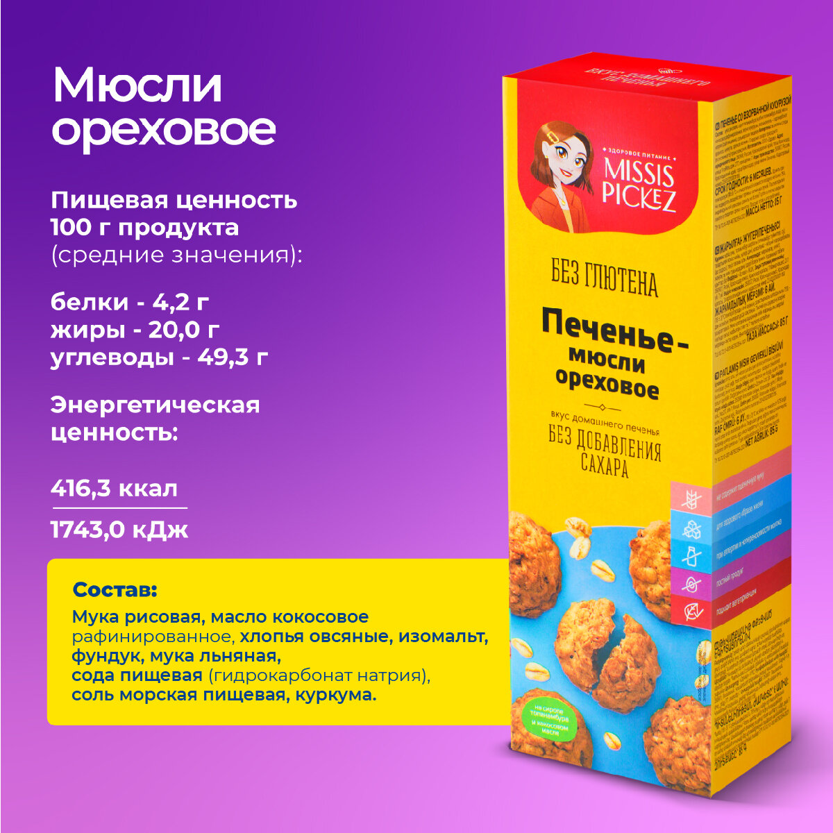 10 цен на Набор печенья без глютена и лактозы "Missis Pickez" Печенье мюсли ореховое, взорванная кукуруза, взорванная гречка, семена льна 4 пачки по 100 г