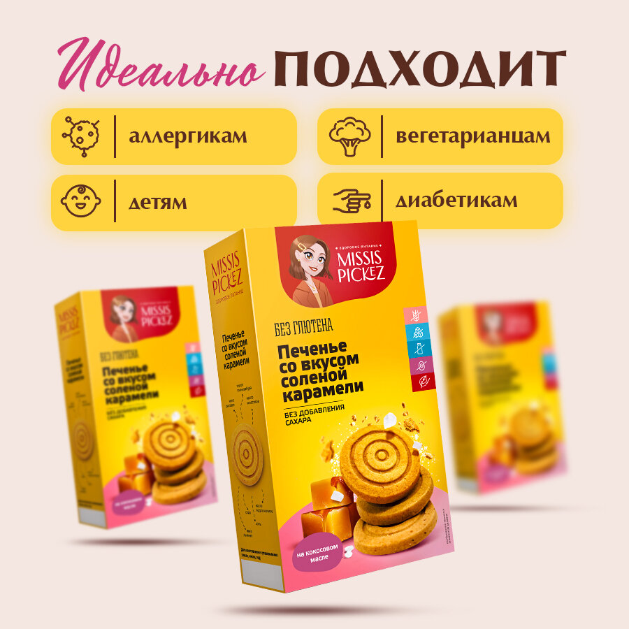 Печенье со вкусом соленой карамели без сахара без глютена "Missis Pickez" 3 пачки по 100 г информация:
