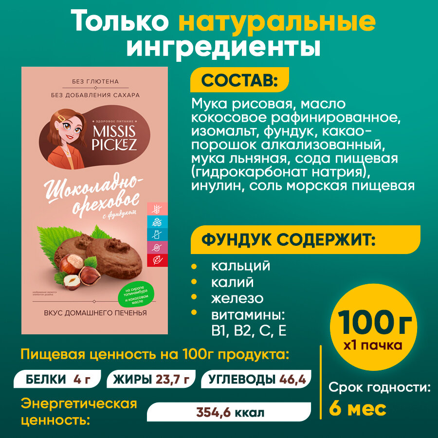 Печенье шоколадно - ореховое без сахара без глютена "Missis Pickez" 14 пачек по 100 г информация: