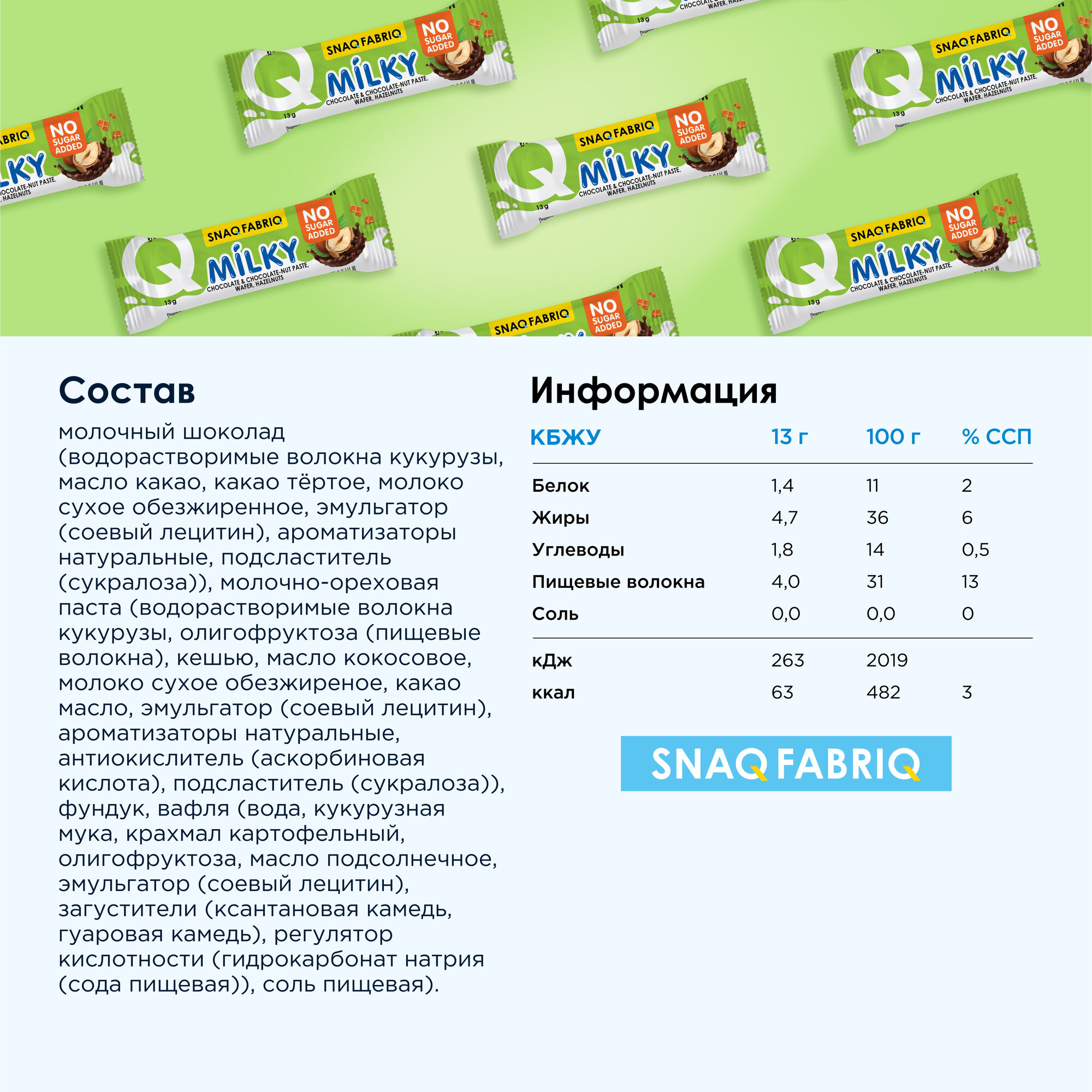SNAQ FABRIQ Шоколадные конфеты без сахара MILKY CANDY с шоколадно-ореховой пастой, вафлей и фундуком, 130г (10шт х 13г) информация: