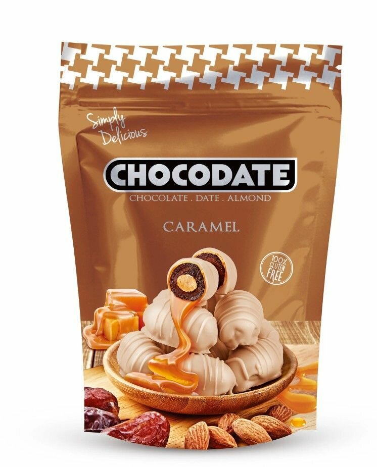 Финики с миндалем и карамелью в сочетании белого и молочного шоколада «Chocodate» 100 грамм информация:
