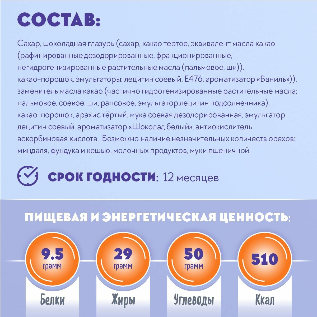 | Состав | шоколадная глазурь (сахар, какао-масло, какао-тертое, какао-порошок, ароматизатор идентичный натуральному Ваниль), какао-порошок, эмульгаторы, сахар, какао тёртое, какао-масло, молоко сухое цельное, ароматизатор, идентичный натуральному аромату), молоко сгущённое, сахар, патока, спирт, коньяк, ароматизатор «Ванильно-сливочный» |