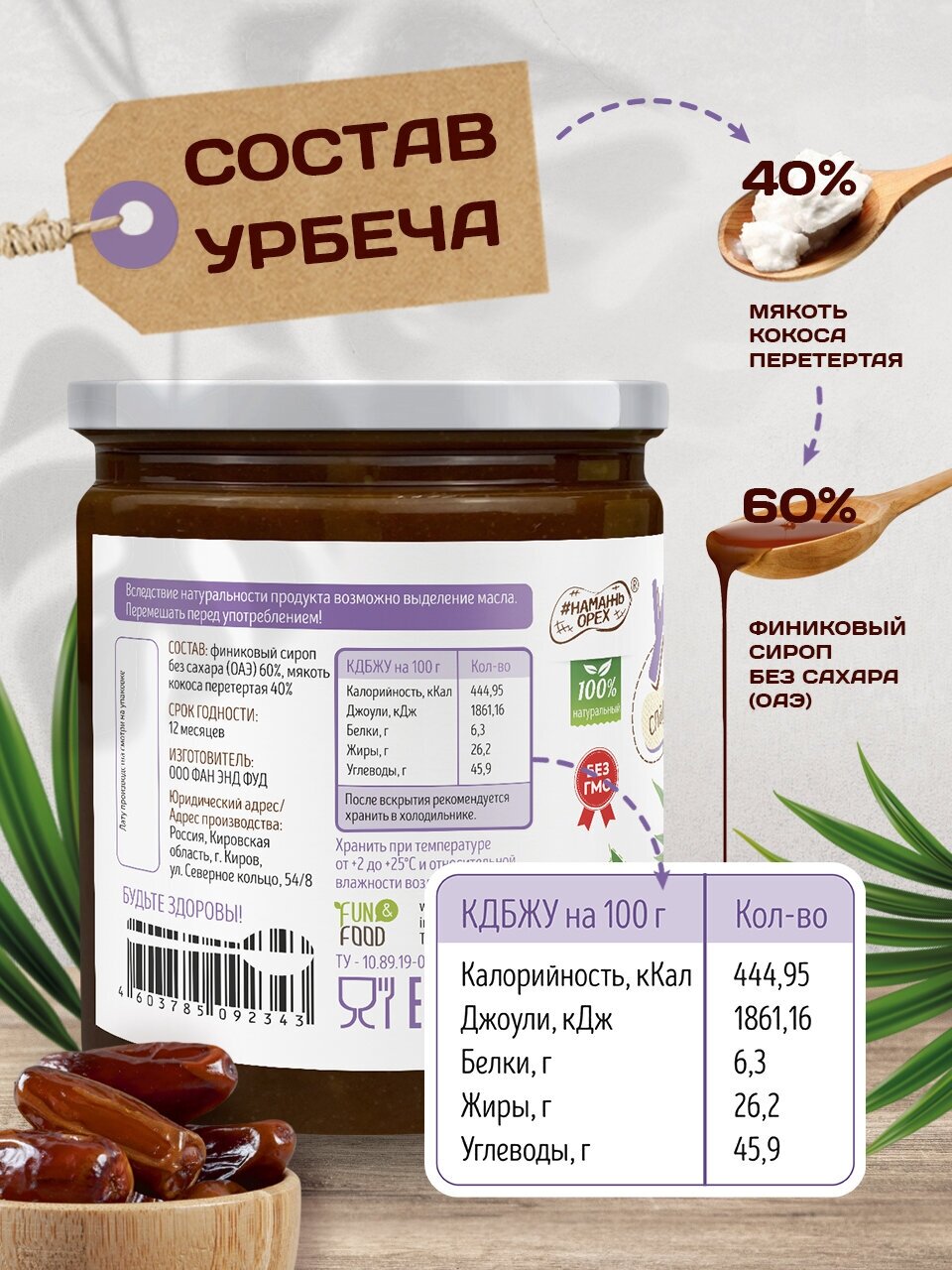 Урбеч кокосовый с фиником без сахара 450 г информация: