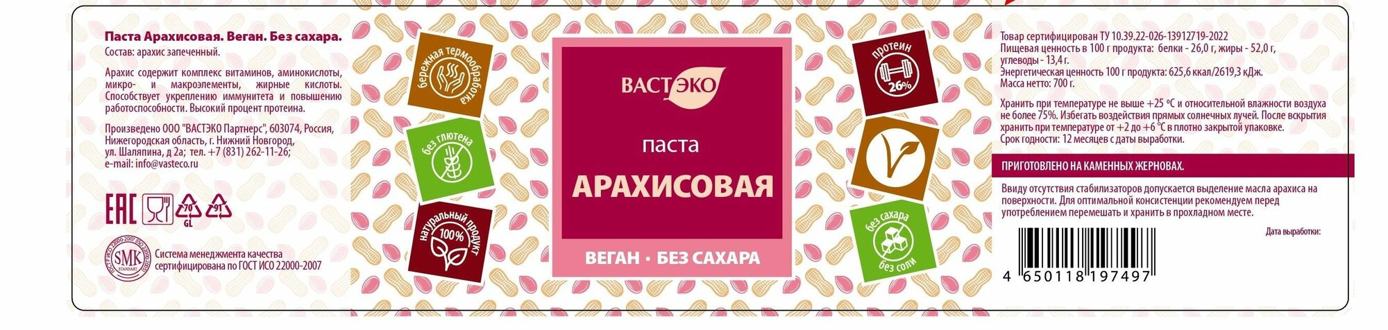 Паста Арахисовая, Веган, без сахара, 700 г/ здоровое питание, без глютена, без лактозы информация: