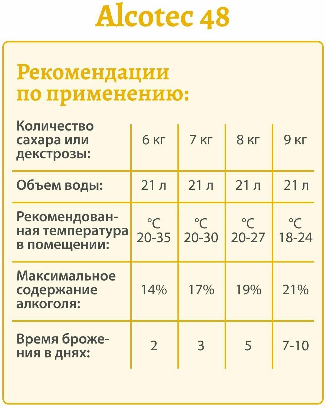 | Дополнительная информация | инструкция: налейте 15 л воды t 25 °С в ферментер. Добавьте необходимое количество сахара (согласно таблице) и размешайте до полного растворения. Доведите общий объём воды до 25 л и обеспечьте необходимую согласно таблице температуру. Всыпьте в раствор дрожжи. Не закрывайте ферментер плотно и не используйте гидрозатвор. Чтобы получить брагу крепостью 21% необходимо постоянно поддерживать температуру в пределах 18-24°С. Для обеспечения этого условия необходимо специальное охлаждающее оборудование. |