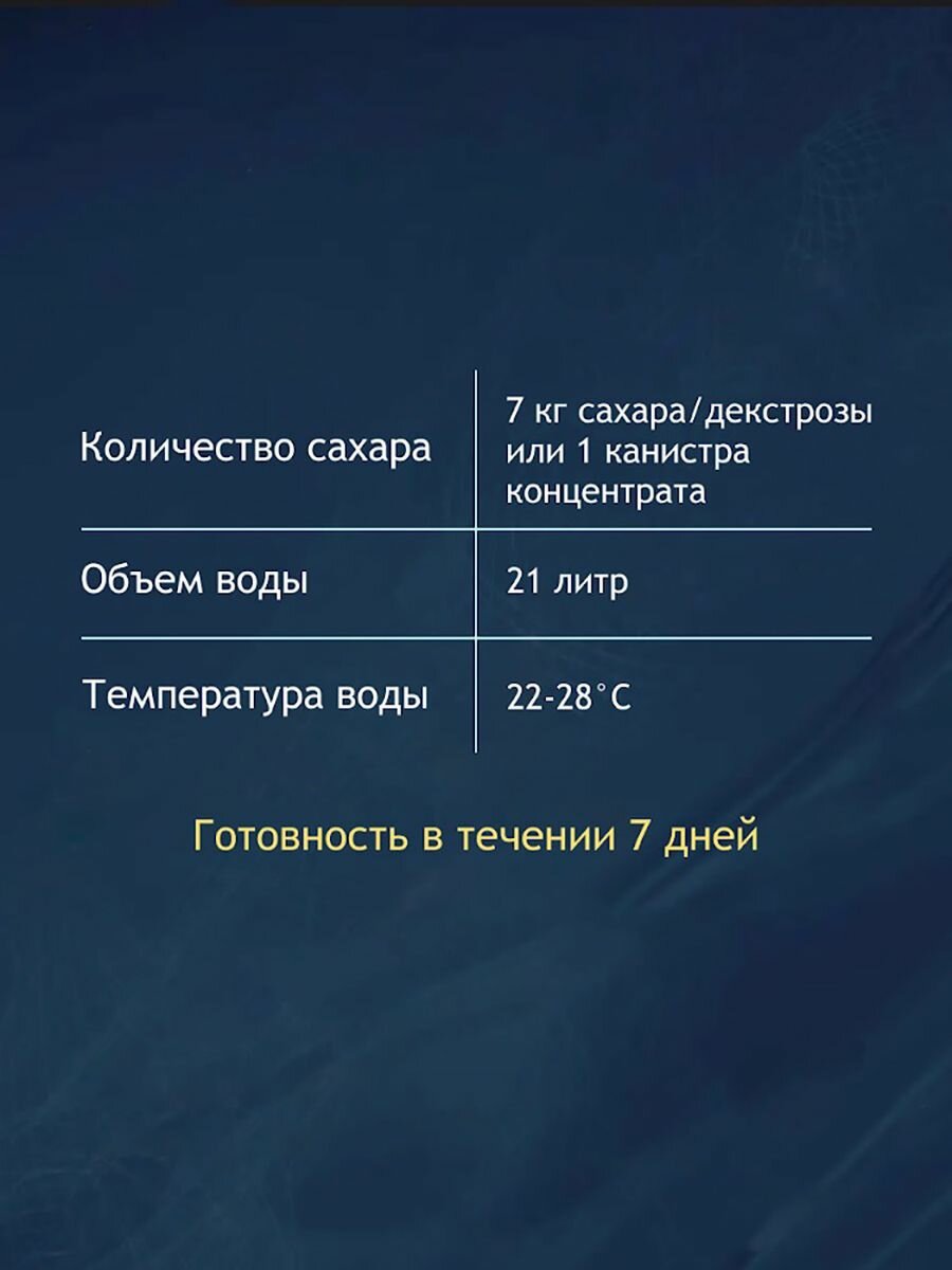 Дополнительная информация | инструкция: налейте 15 л воды t 25 °С в ферментер. Добавьте необходимое количество сахара (согласно таблице) и размешайте до полного растворения. Доведите общий объём воды до 25 л и обеспечьте необходимую согласно таблице температуру. Всыпьте в раствор дрожжи. Не закрывайте ферментер плотно и не используйте гидрозатвор. Чтобы получить брагу крепостью 21% необходимо постоянно поддерживать температуру в пределах 18-24°С. Для обеспечения этого условия необходимо специальное охлаждающее оборудование. |