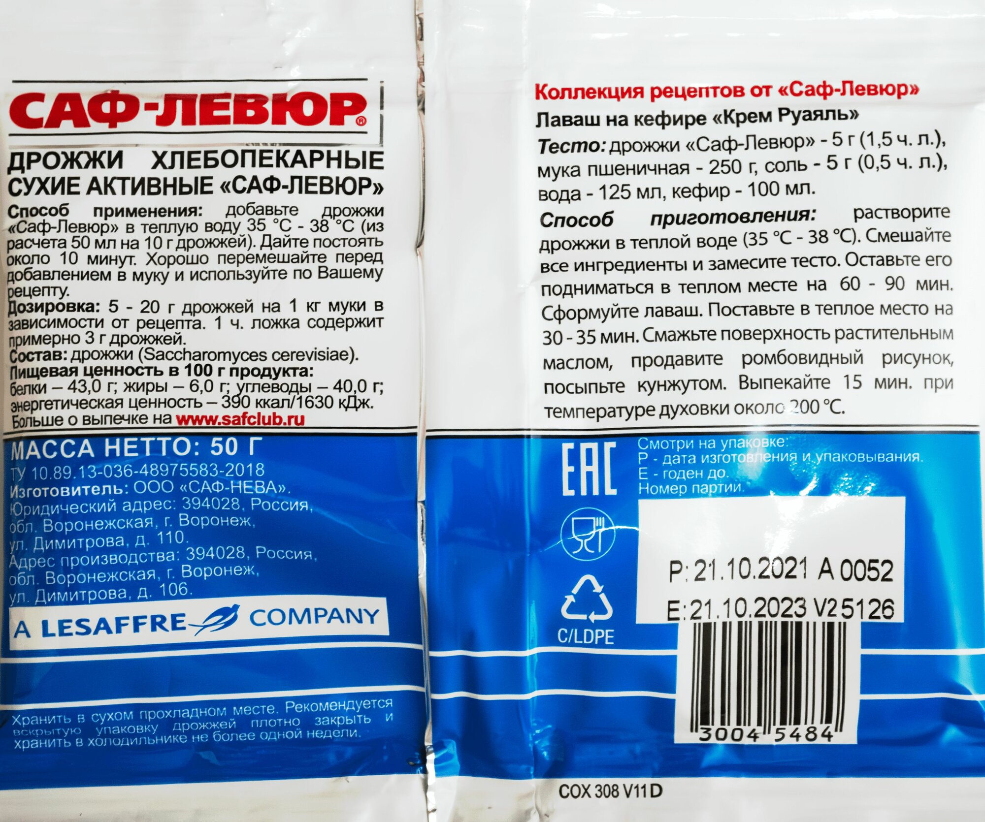 Дрожжи сухие активные саф-левюр 50 г*2 шт информация: