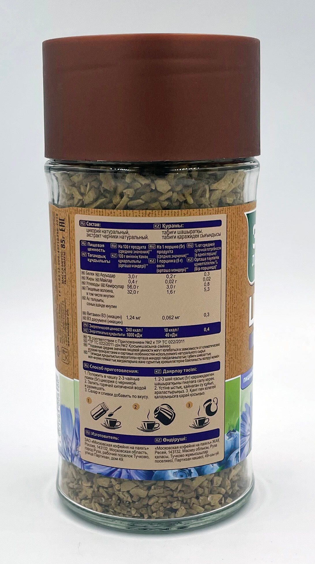 | Способ приготовления | Положить в чашку 2-3 чайные ложки (5г) цикория с черникой. Залить горячей кипяченой водой и размешать. Сахар и сливки добавить по вкусу. |