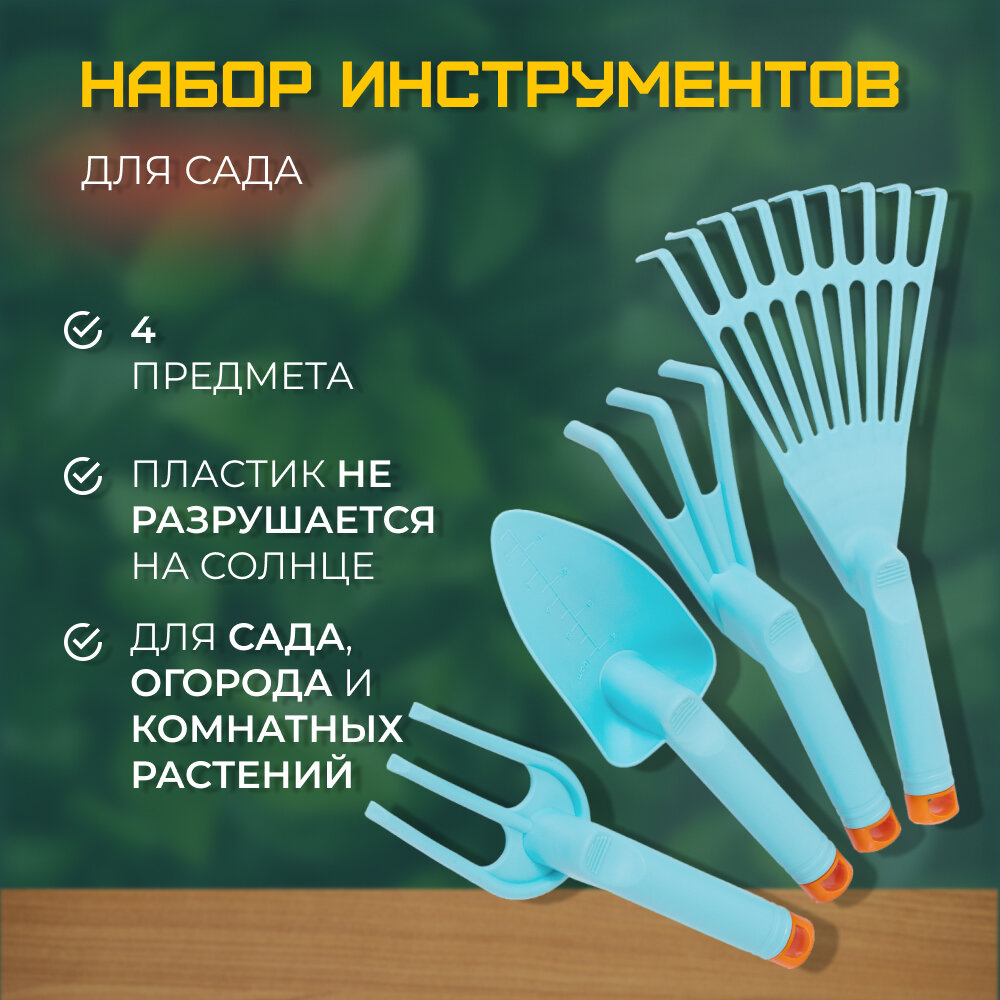 | Дополнительная информация | В наборе: посадочный совок , посадочная вилка, рыхлитель, грабли веерные. Применяются для садовых работ по посадке и пересадки растений, рыхления почвы, сбора мелкого мусора в ограниченном пространстве. Изготовлены из первичного полипропилена с высоким содержанием эластомеров, что гарантирует надежность в эксплуатации. За счет высокого содержания УФ фильтров пластик не разрушается на солнце. |