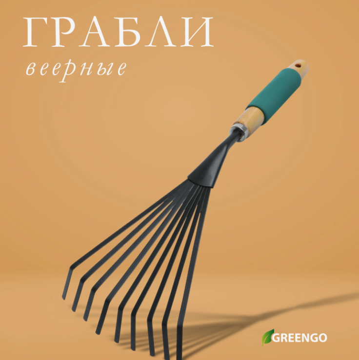 10 цен на Грабли малые, веерные, пластинчатые, 9 зубцов, длина 42 см, металл, деревянная ручка с поролоном, Greengo