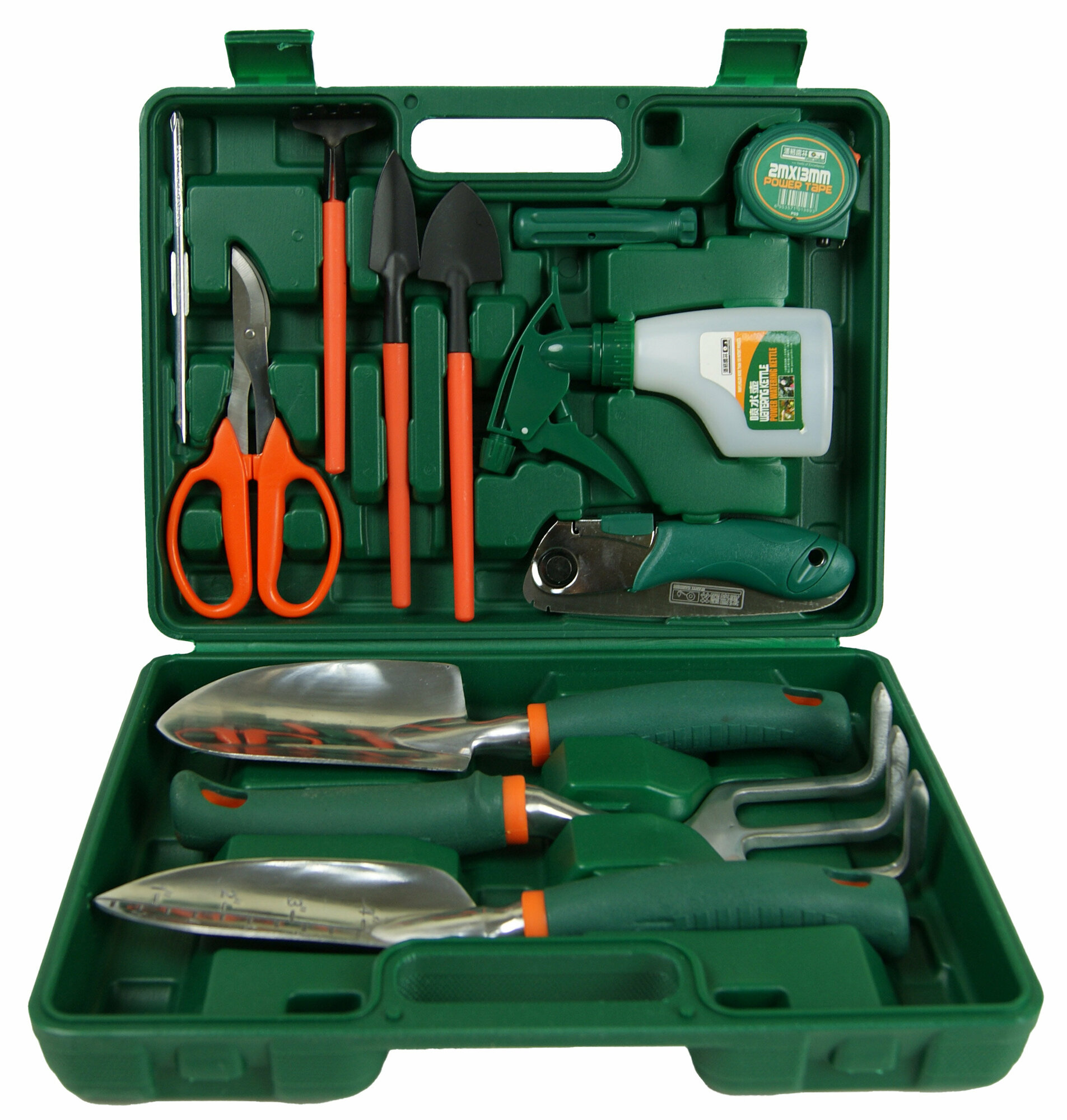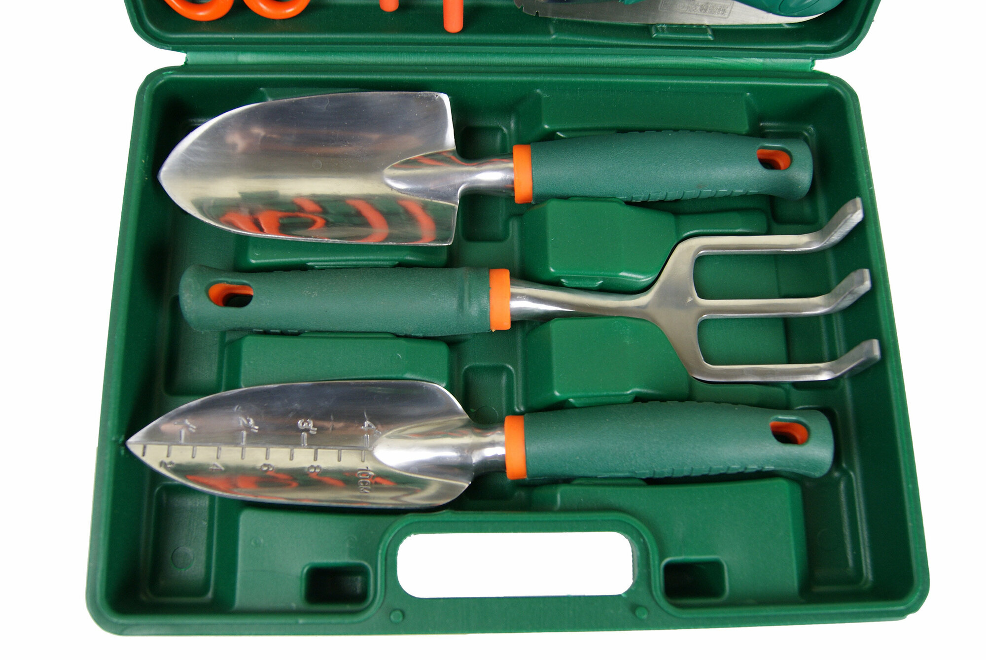 | Дополнительная информация | в комплекте: отвертка со сменной головкой, садовые ножницы, мини-совок широкий, мини-шпатель, мини-грабли, рулетка, бутылка для полива с распылителем, пила складная, садовая лопатка из нержавеющей стали, садовые грабли из нержавеющей стали, садовый дозатор из нержавеющей стали, кейс; размер кейса: 350х265х80 мм |