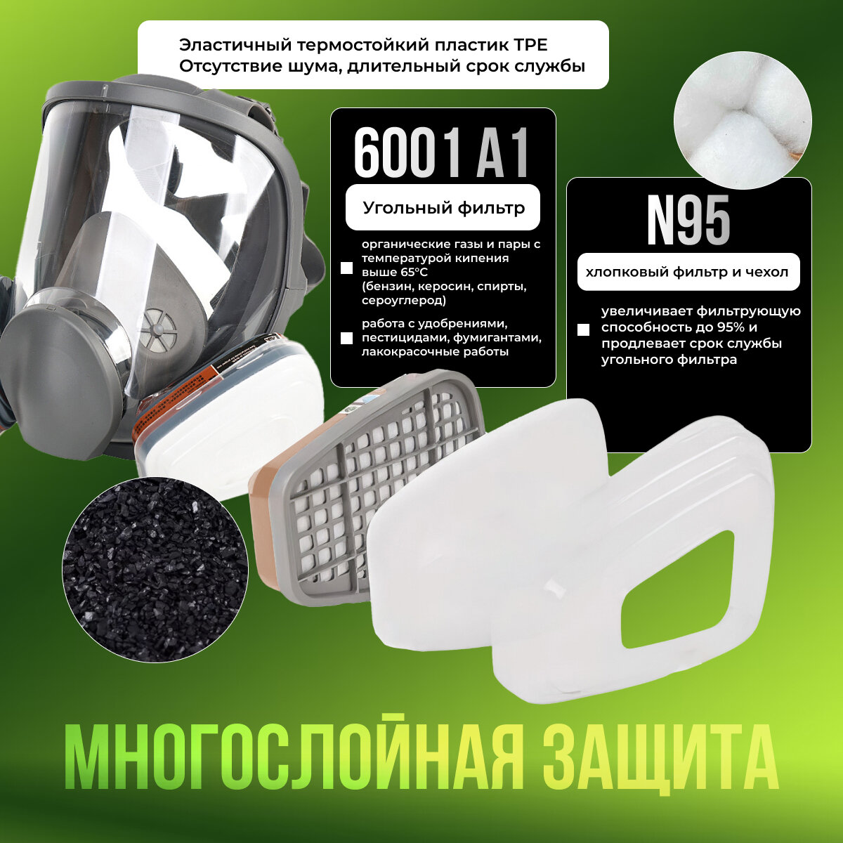 Профессиональный противогаз-респиратор маска защитная 6800 замена 3М с угольным фильтром распиратор от краски пыли аллергии многоразовый информация: