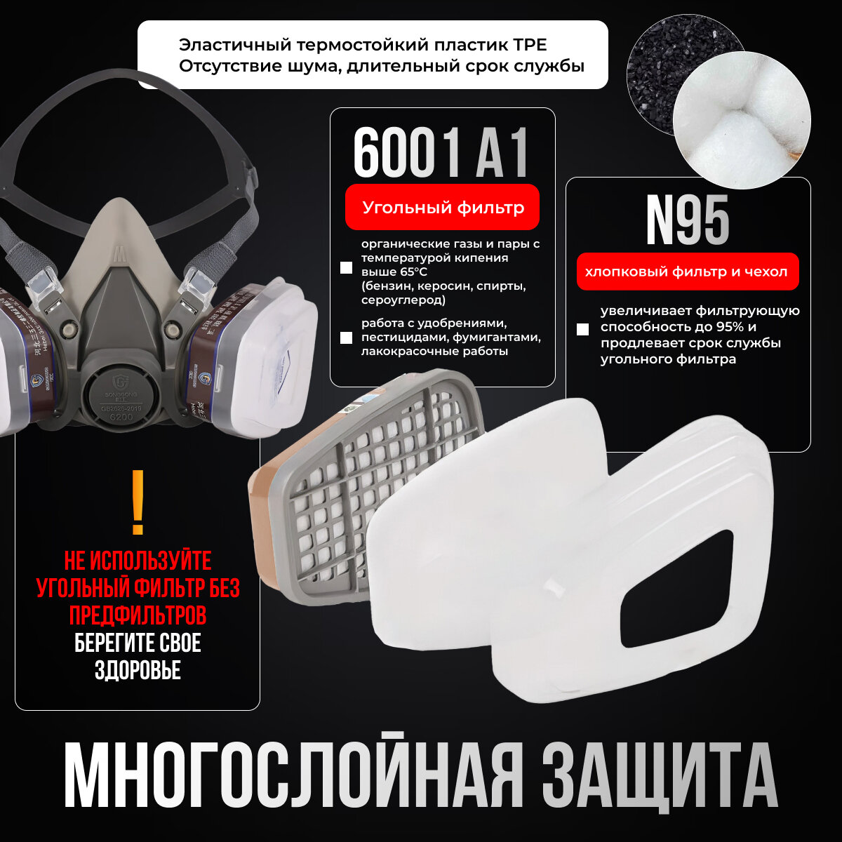 Профессиональный респиратор противогаз маска защитная 6200 замена 3М с угольным фильтром от химии, Master Pokupok информация: