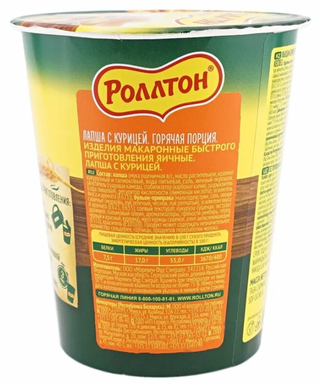 | Состав | "Лапша (мука пшеничная в/с, масло растительное, крахмал кукурузный и тапиоковый, вода питьевая, соль, яичный порошок, загуститель (гуаровая камедь), стабилизатор (карбонат калия), разрыхлитель (сода пищевая), регулятор кислотности (лимонная кислота), усилитель вкуса и аромата (Е621)), Бульон-приправа (мальтодекстрин, соль, овощи сушеные (морковь, лук зеленый, чеснок, лук репчатый), усилители вкуса и аромата (Е621, Е635), соевый текстурат, кукуруза сушеная, экстракт дрожжей, пальмовый олеин, ароматизаторы, пряности (имбирь, перец черный и красный, куркума), мясо курицы сушеное, агент антислеживающий (Е551), краситель (Е101(i))). Продукт может содержать незначительное количество сельдерея, горчицы, продуктов переработки молока. До" |