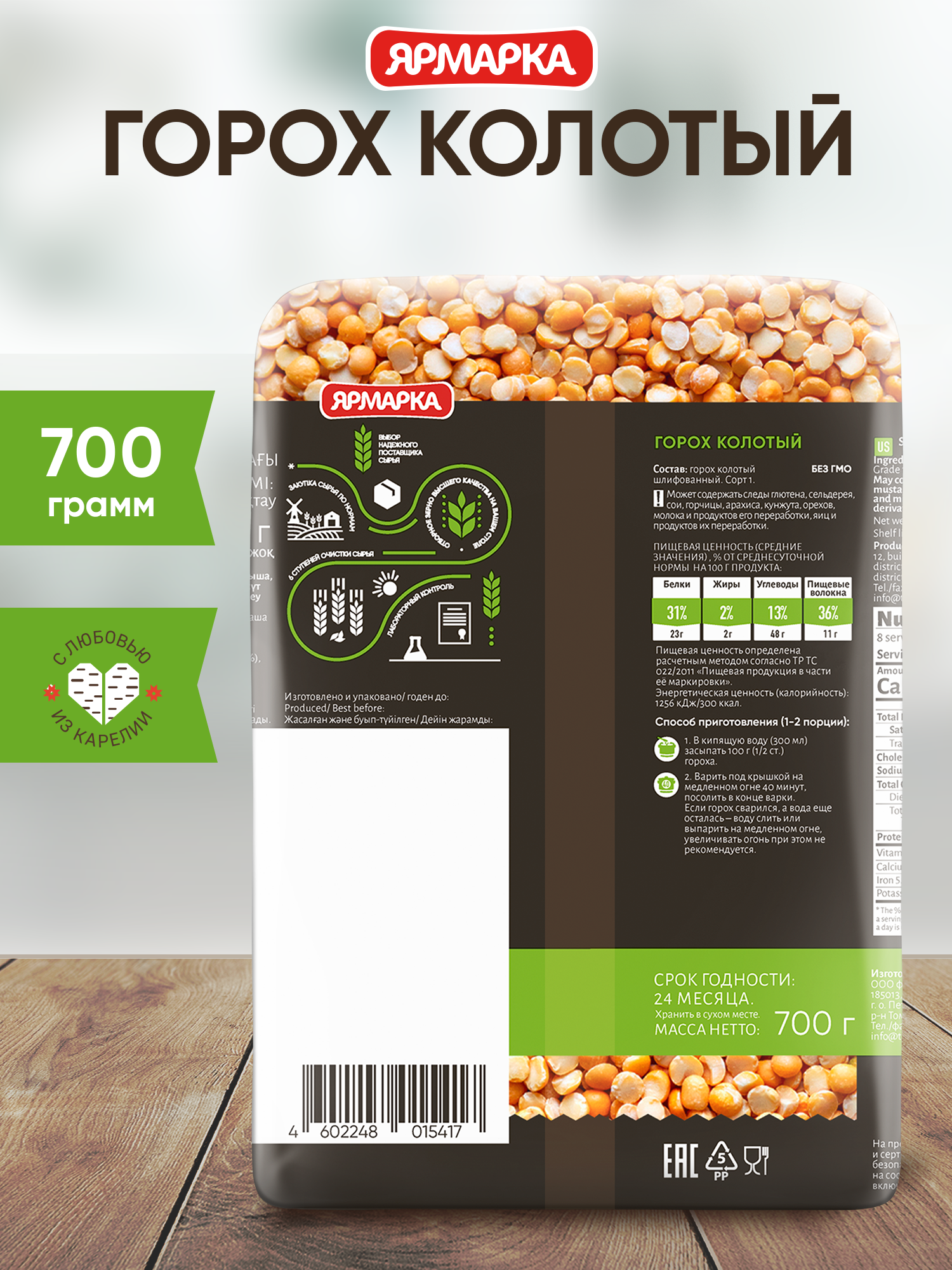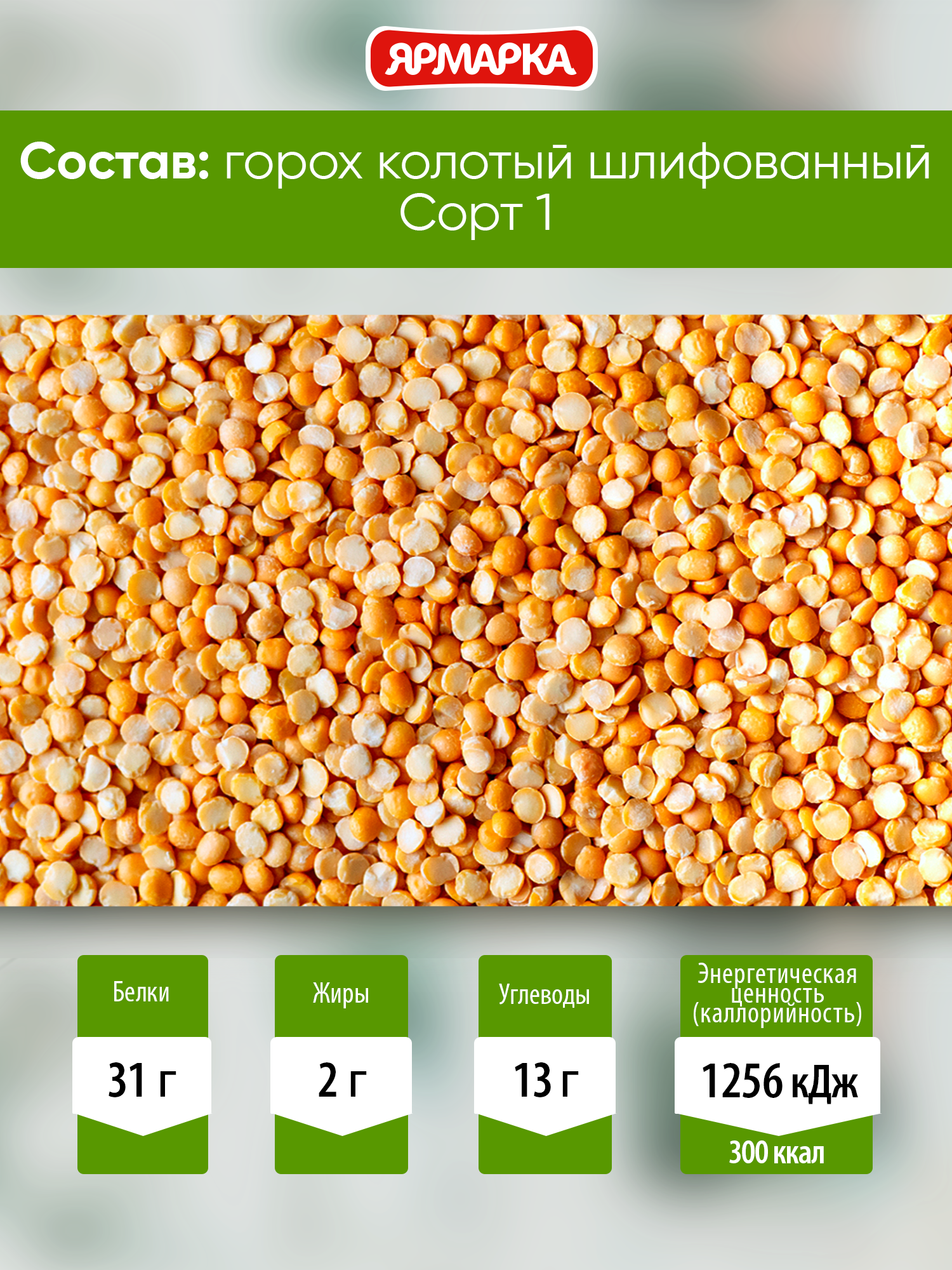 | Состав | горох колотый шлифованный. Сорт 1. Может содержать следы глютена, сельдерея, сои, горчицы, арахиса, кунжута, орехов. |
