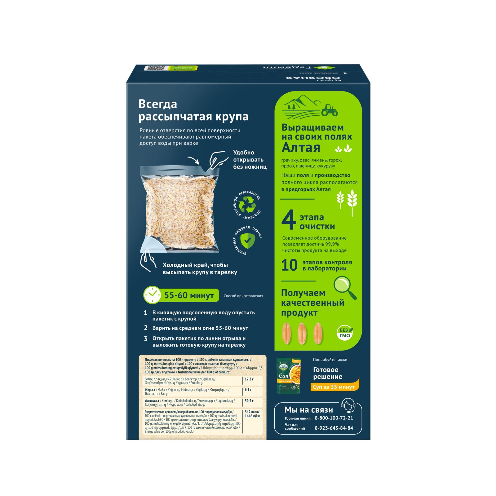 | Способ приготовления | в кипящую подсолённую воду опустить пакетик с крупой. Варить на среднем огне 55-60 минут. Открыть пакетик по линии отрыва и выложить готовую крупу на тарелку |